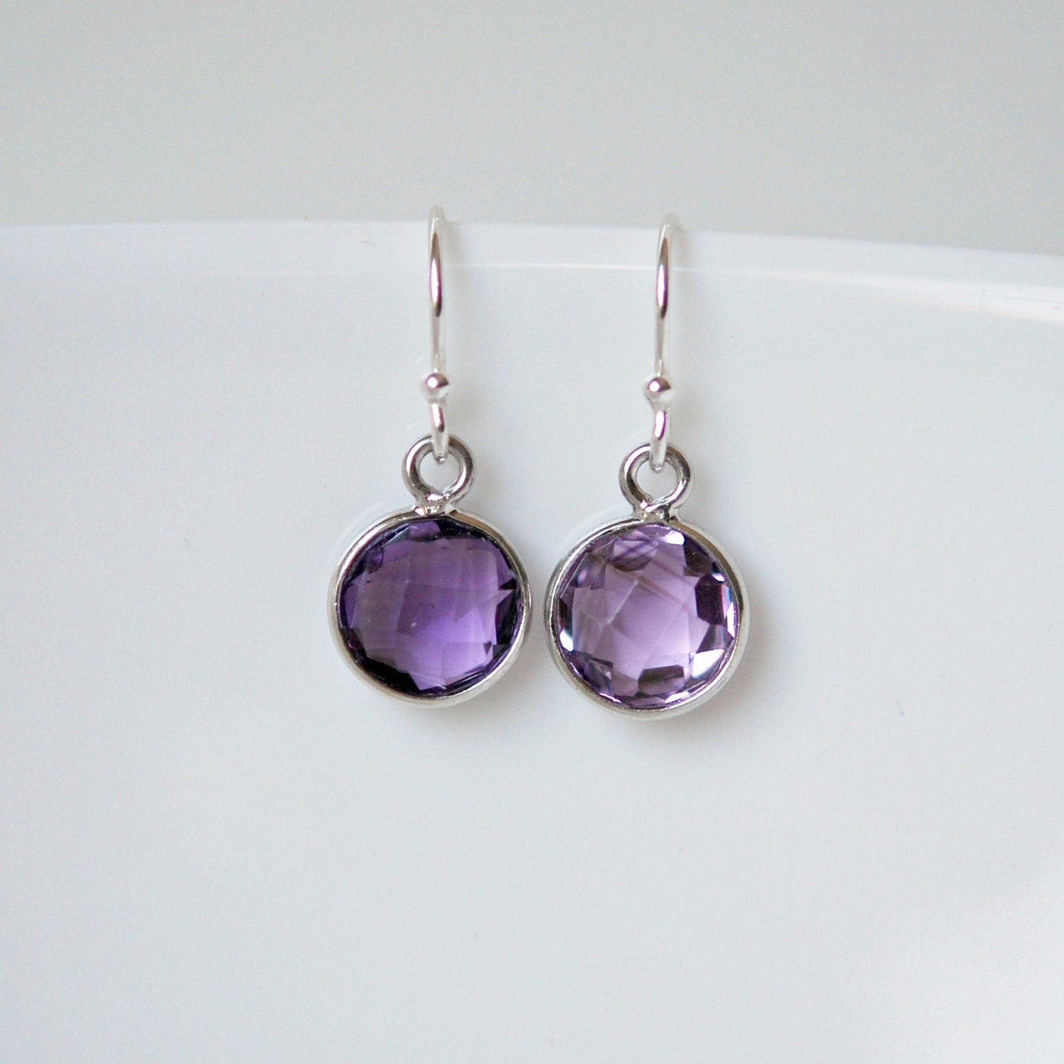 A delicate pair of faceted round genuine amethyst gemstones that have been bezel set in sterling silver form these sweet earrings. Perfect for everyday! Please note that the colour in the photos may vary slightly from the actual gemstones you receive as colour varies on natural gems.