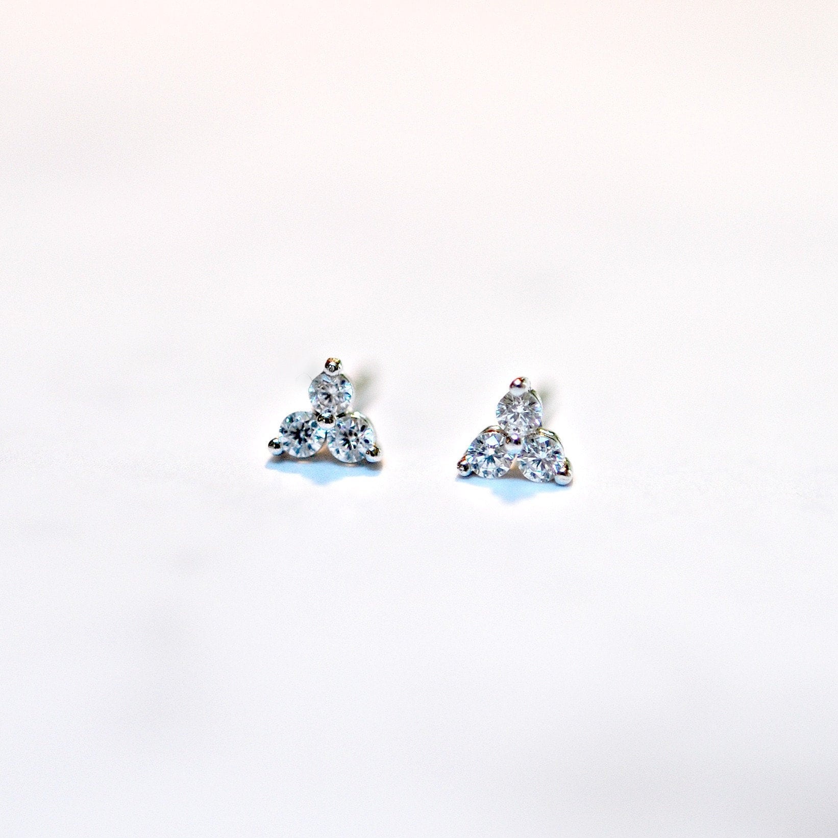 These shimmering earrings are a lovely option for everyday wear. Great for adding some glimmer and gleam to multi-ear piercings. Three tiny clear round cubic zirconias that sparkle like diamonds are set in silver, gold or rose gold forming a modern triangle....these would make a perfect gift for anyone of any age.