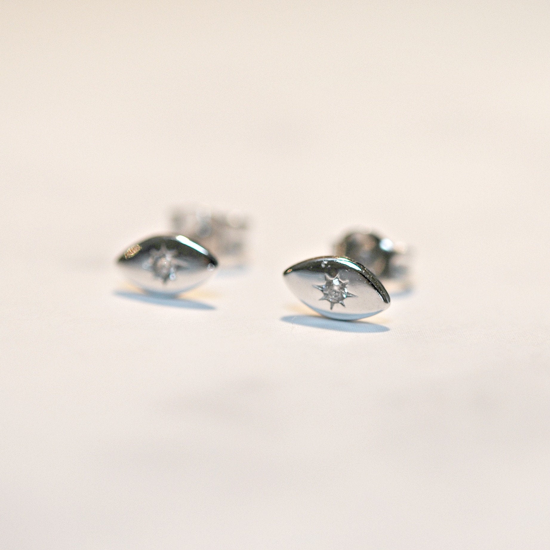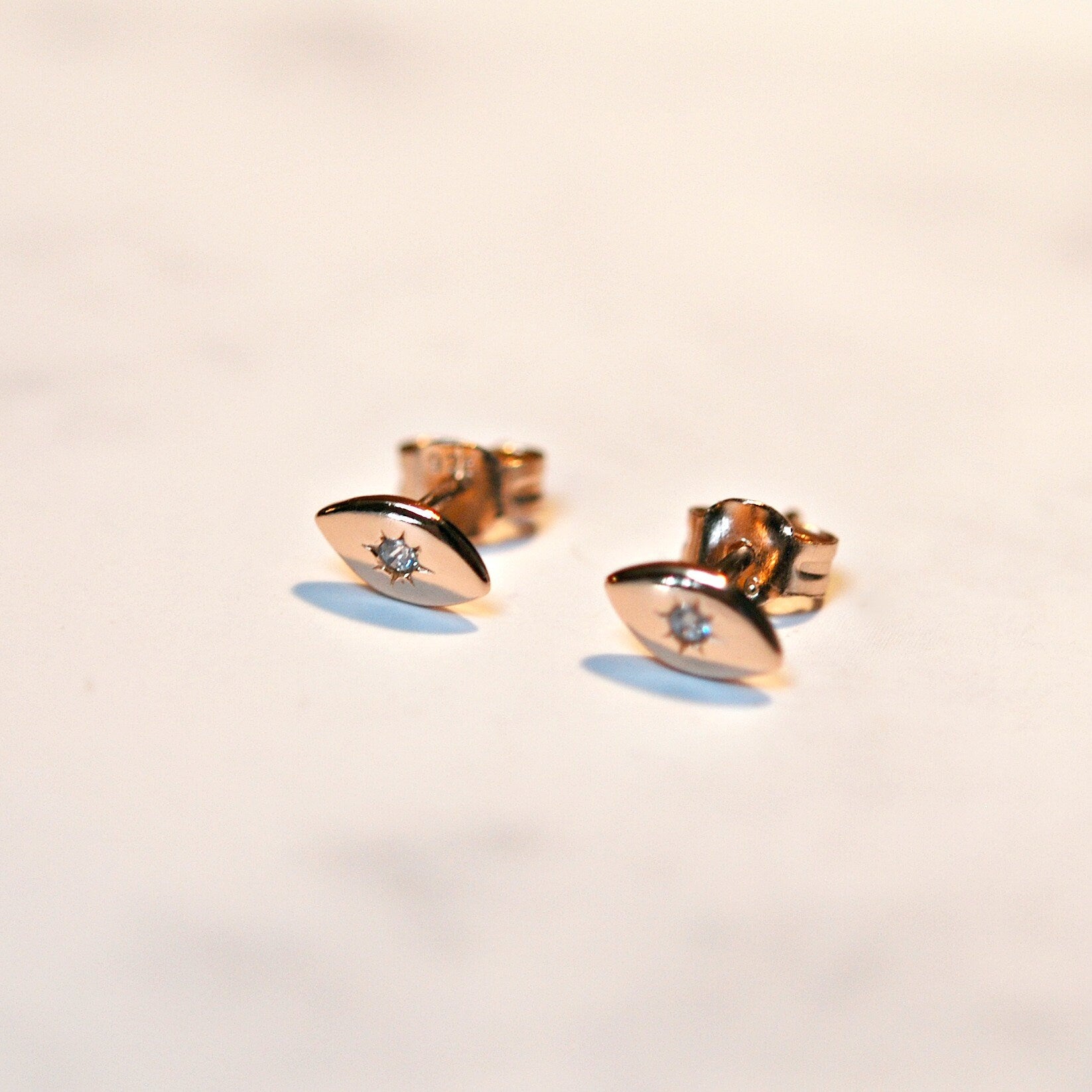 Bad vibes be gone! Our evil eye stud earrings are versatile enough to wear in your first, second, or even cartilage piercing. The subtle cubic zirconia highlights the eye shape and adds even more sparkle to this everyday earring. Available in silver, gold or rose gold.