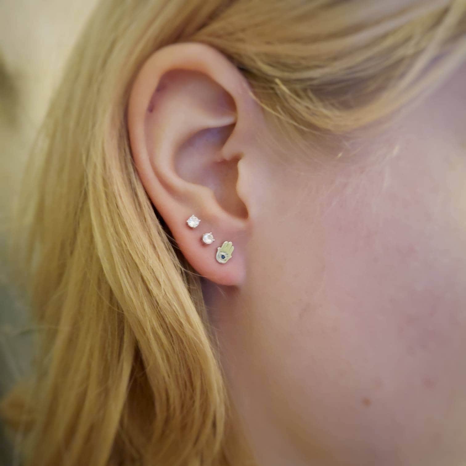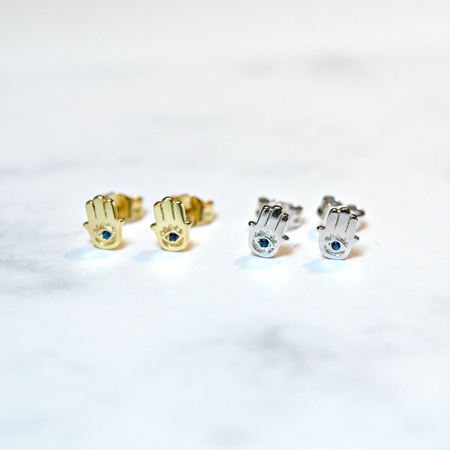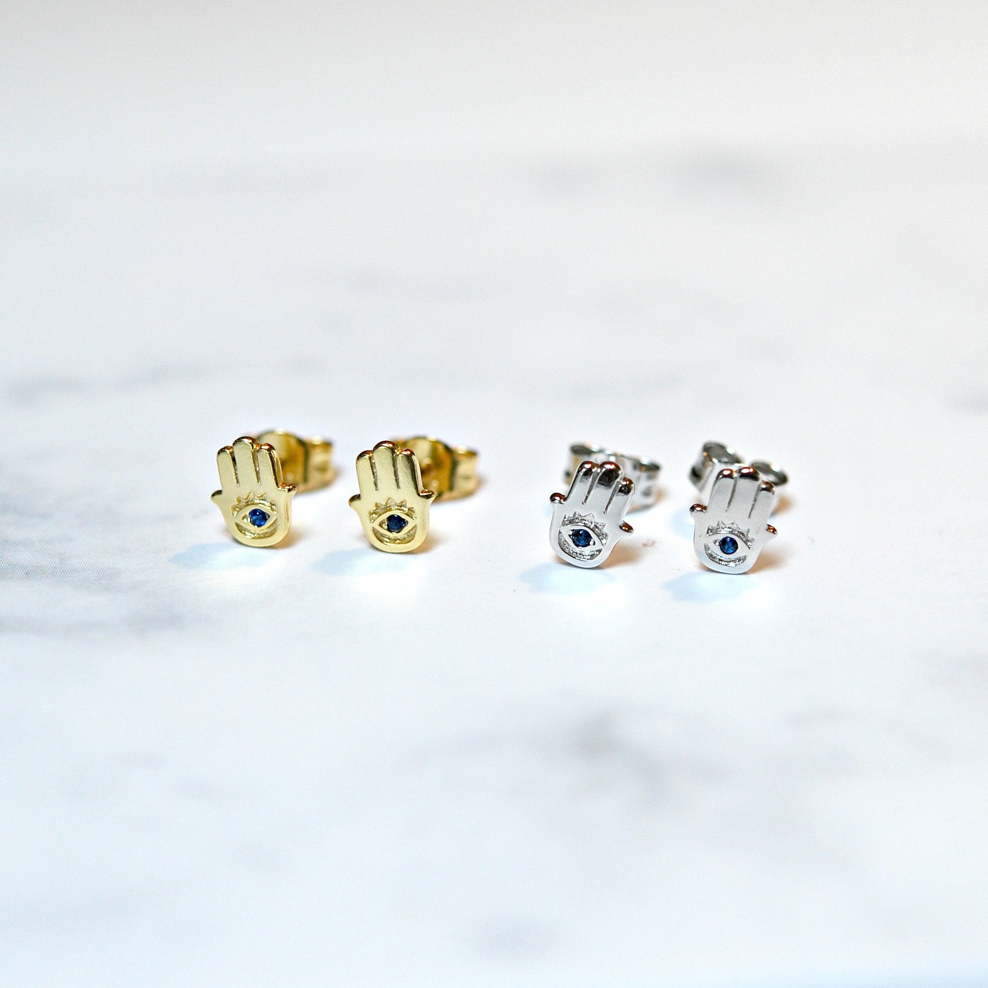 Trendy hamsa hand stud earrings with a tiny blue cubic zirconia....if you are looking for a simple pair of edgy studs for everyday wear these are perfect! Available in silver, gold or rose gold.