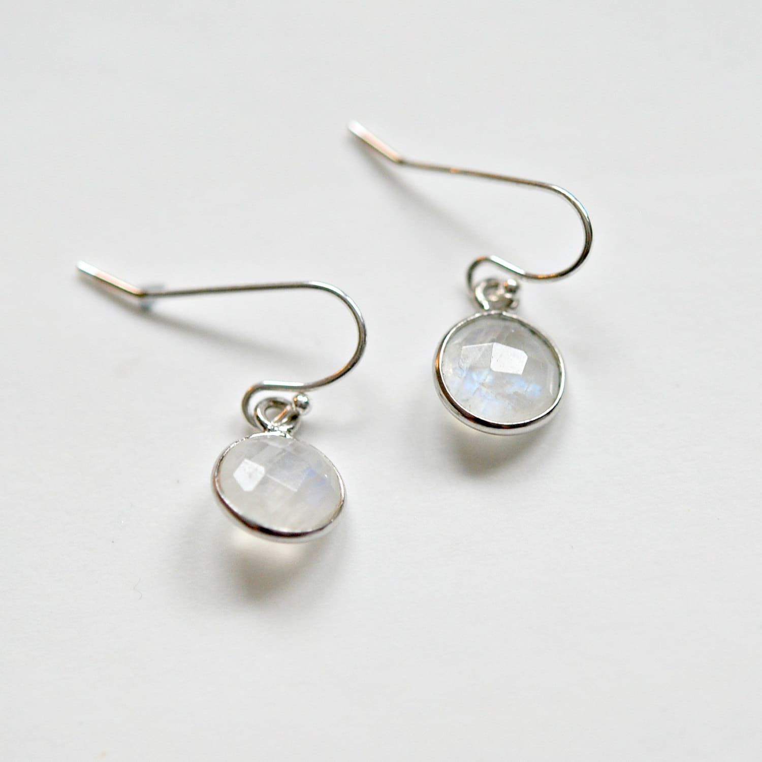 A delicate pair of faceted round genuine moonstone gemstones that have been bezel set in sterling silver form these sweet earrings. Perfect for everyday! Please note that the colour/opaqueness in the photos may vary slightly from the actual gemstones you receive as colour varies on natural gems.