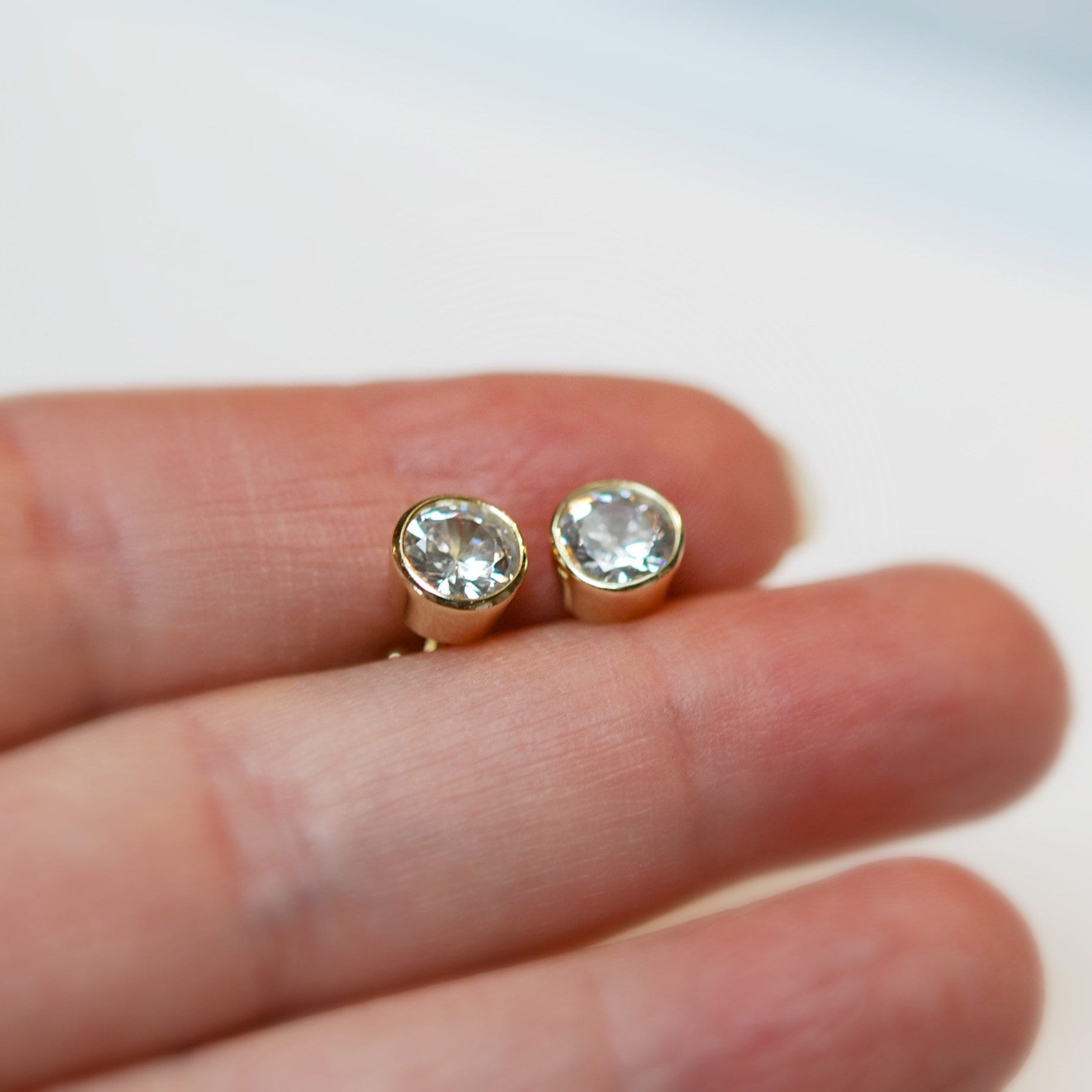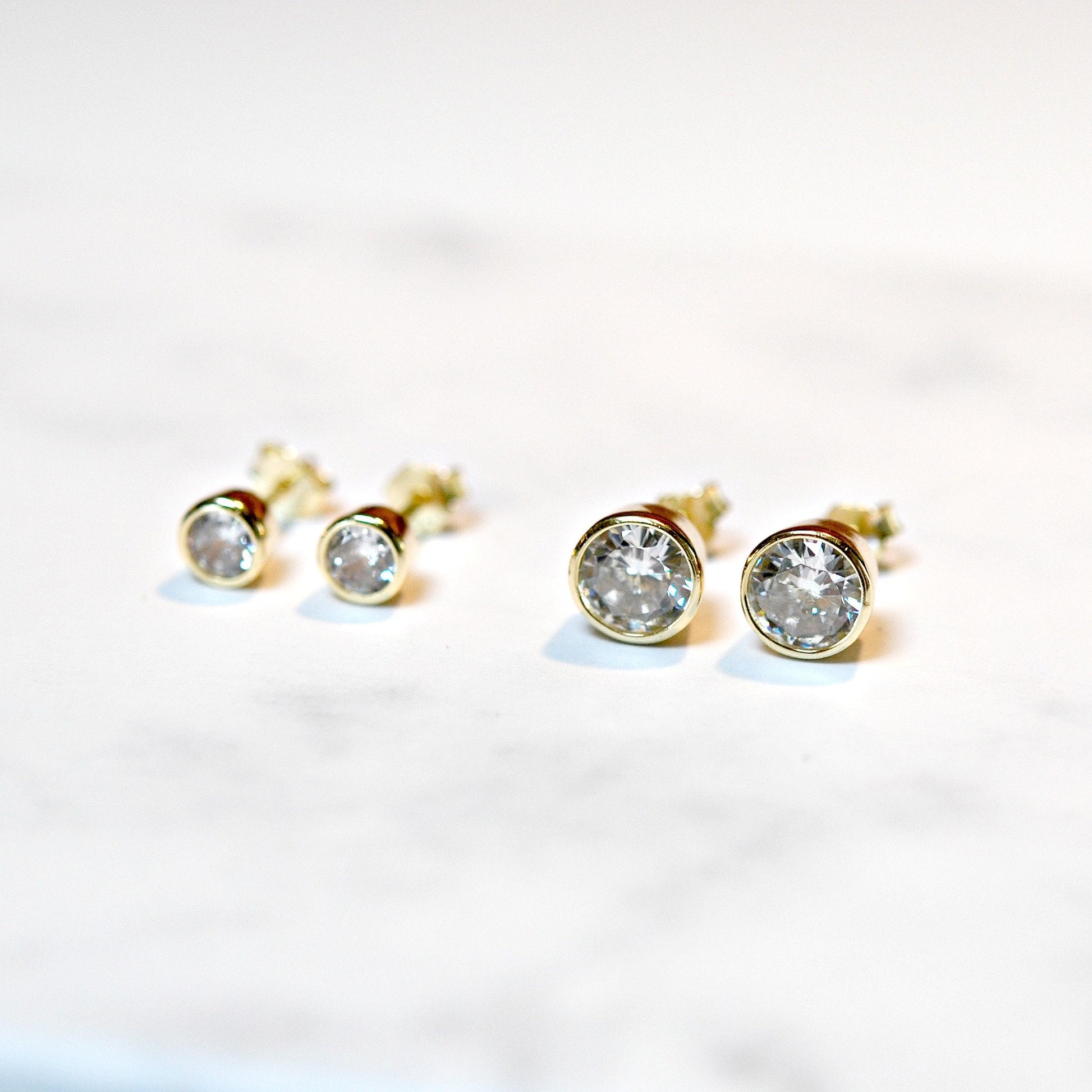 Sweet little clear round cubic zirconias that sparkle like diamonds are bezel set....these would make a perfect gift for anyone of any age. If you are looking for a simple pair of classic earrings for everyday wear these are perfect! Available in gold or rose gold.