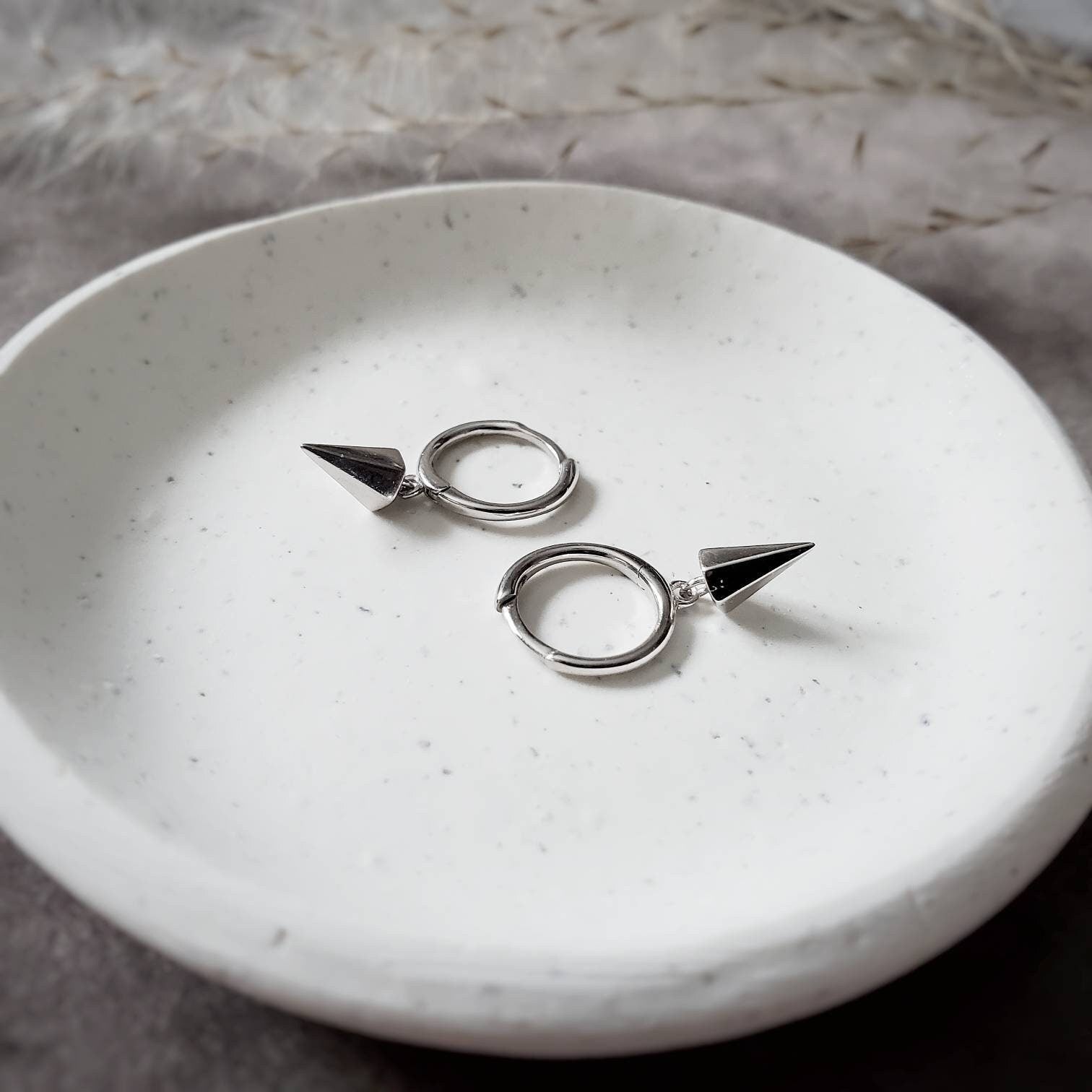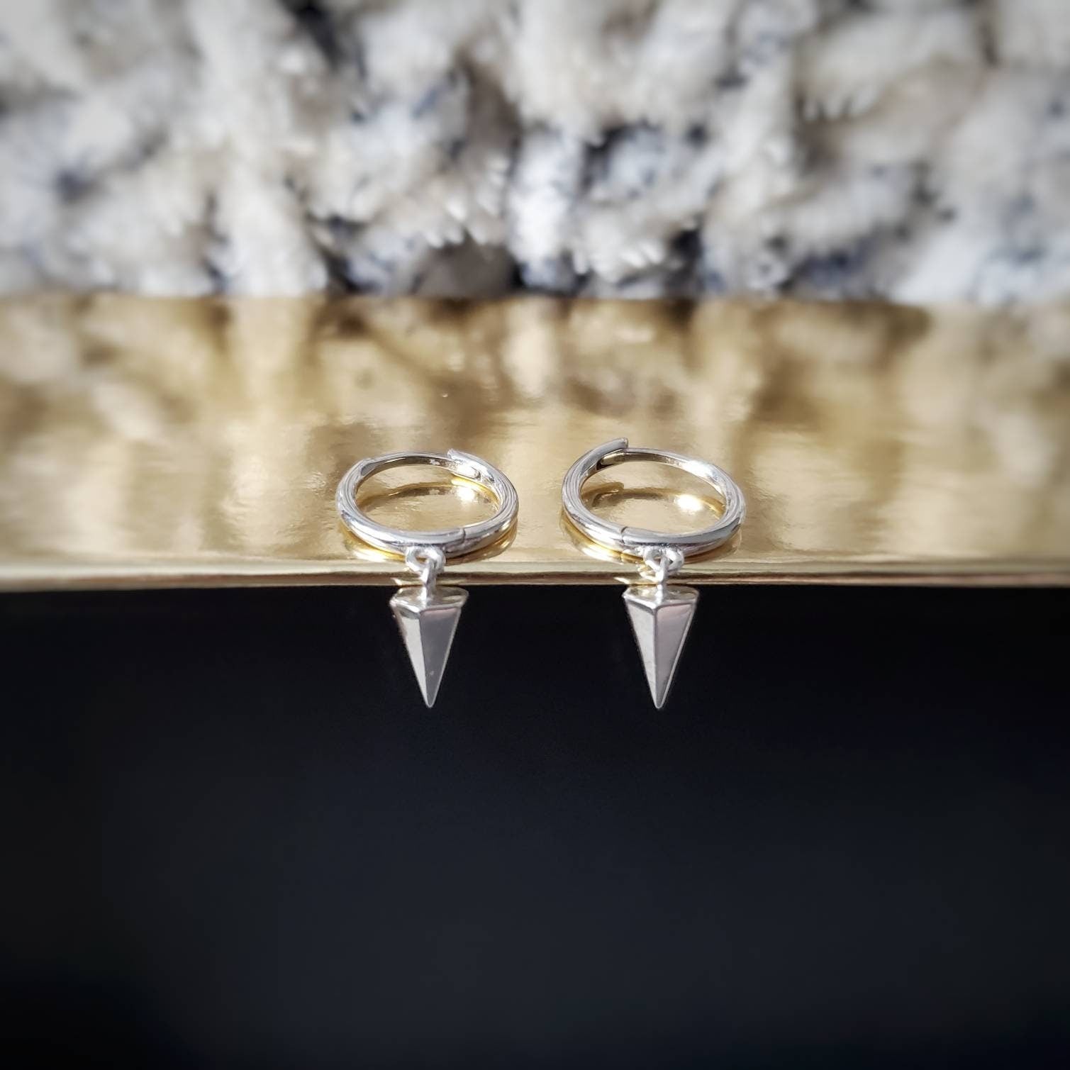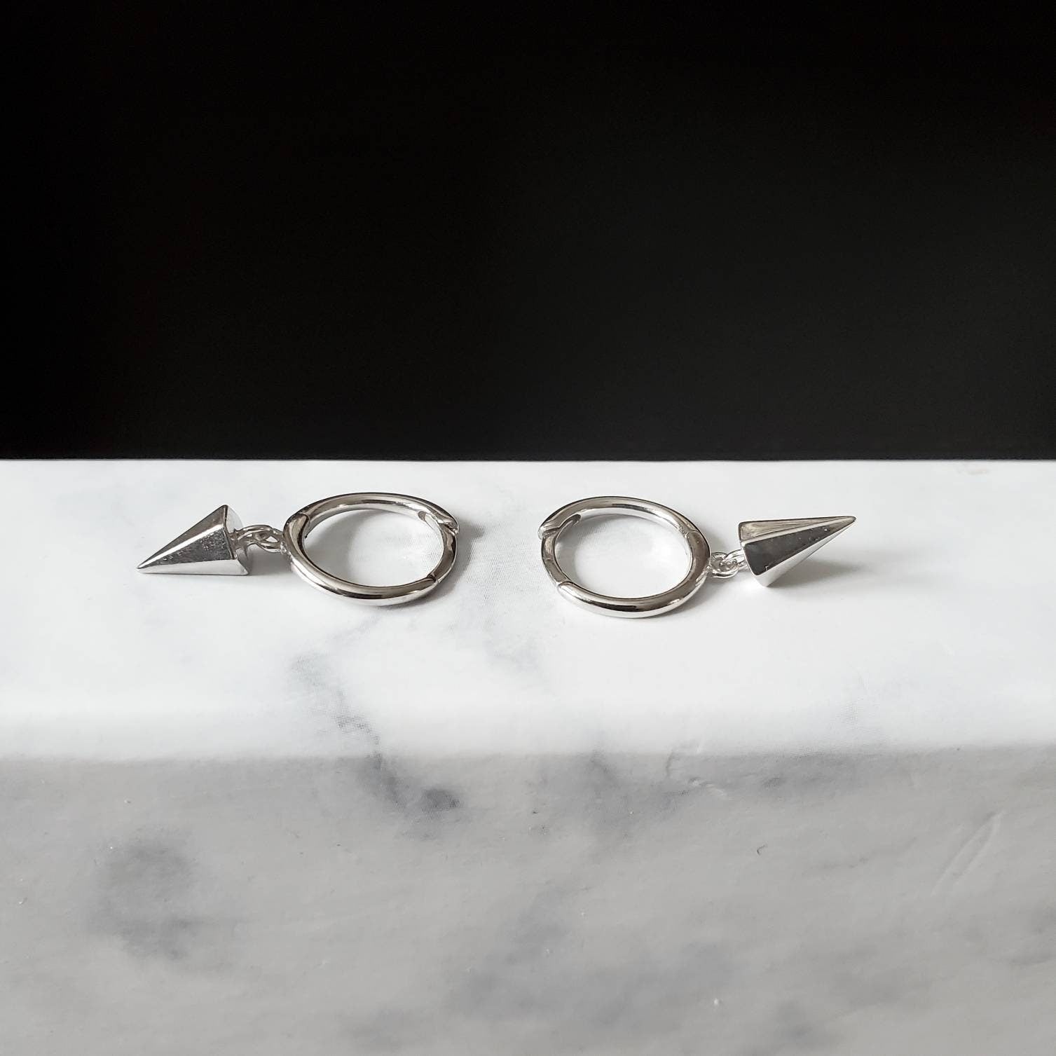 Simple and just a little bit edgy. A slender sterling silver huggie hoop holds a tiny spike dangle. Perfect for everyday wear!