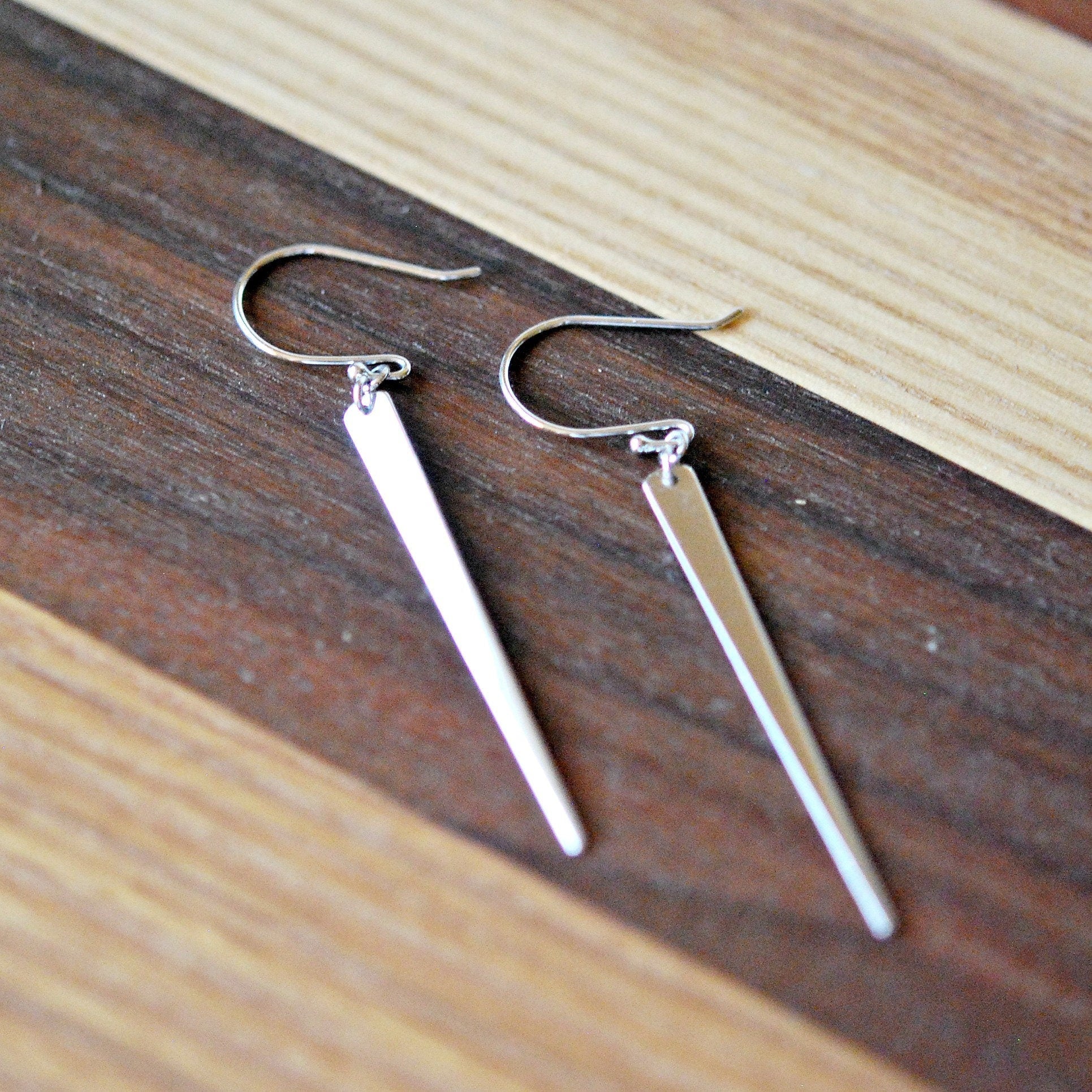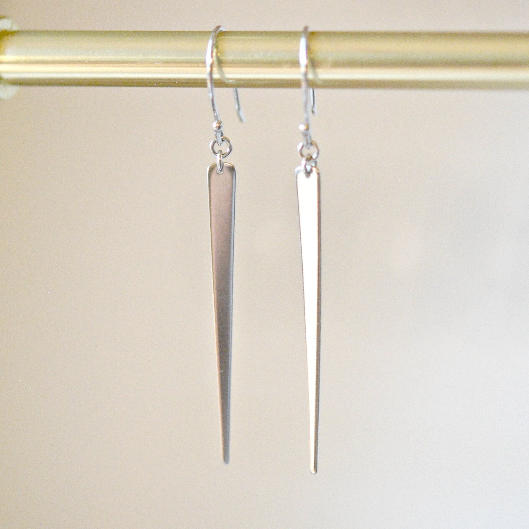 Simple yet sexy sterling silver flat spikes are suspended from sterling silver ball earwires. An everyday favorite! NEW - now available in gold....