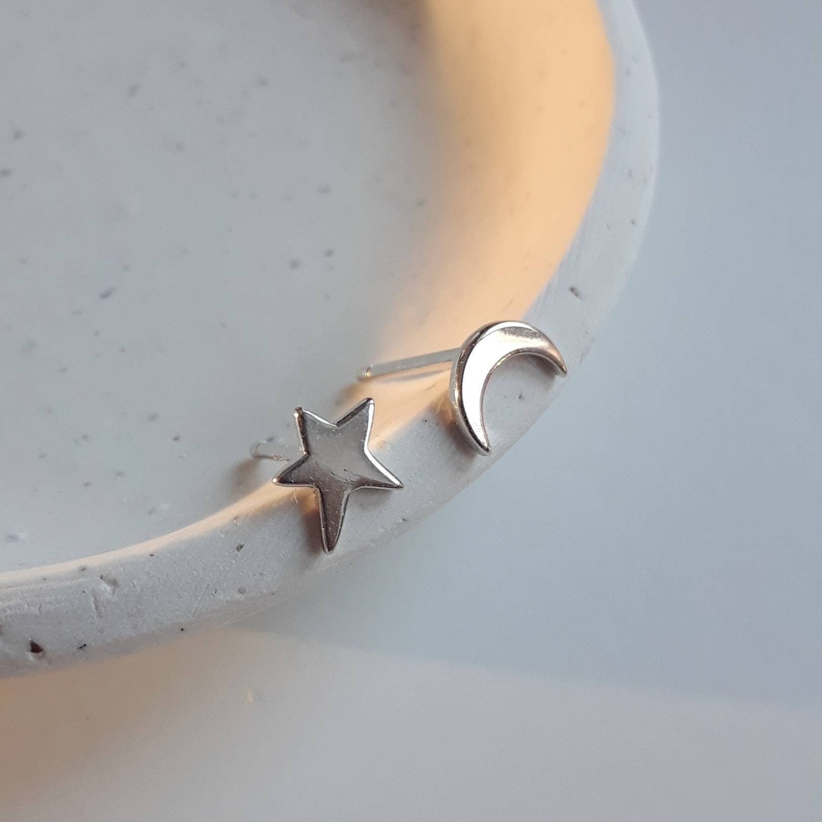 Capture the beauty of the night sky with this iconic duo of a crescent moon and star stud. Dreamy and delicate, this heavenly pairing is a shining reminder that you are full of potential and light. Wear one in each ear for a fresh take or stack them in the same ear for a bold statement.